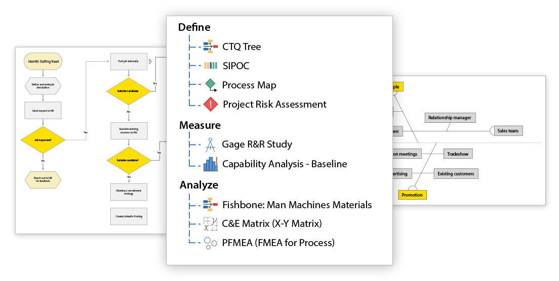 - DMAIC (Definieren, Messen, Analysieren, Verbessern, Kontrollieren)