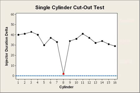 Außerdem entwickelte das Team eine Methode, um defekte Einspritzdüsen zweifelsfrei erkennen zu können. Bei jedem LKW wurde der Motor auf eine Drehzahl von 700 U/min gebracht, und die Einspritzzeitpunkte bei allen 16 Zylindern wurden gemessen. Danach wurden die Zylinder einzeln abgeschaltet, so dass die verbleibenden 15 Zylinder die 700 U/min aufrecht erhalten mussten. Wenn beim Abschalten eines Zylinders keine erheblichen Änderungen an den verbleibenden Zylindern beobachtet wurden, hatte dieser Zylinder nicht die volle Leistung erbracht und benötigte eine neue Einspritzdüse. Dieser Test wurde seitdem in die Wartungsverfahren für die Flotte aufgenommen. Die Ergebnisse werden auf Regelkarten dargestellt, die mit Minitab-Makros schnell erstellt werden können.
