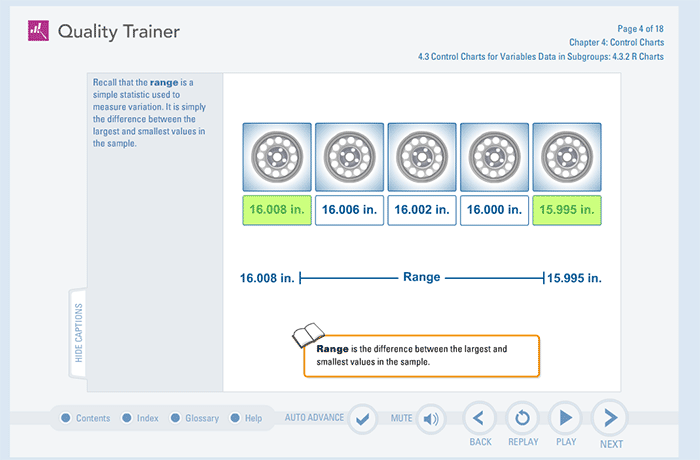Al explicar los conceptos estadísticos clave y luego ilustrar cómo aplicarlos en Minitab Statistical Software, Quality Trainer asegura que los participantes compartan una base común de conocimientos al llegar al salón de clases. Y con la capacidad de seguimiento incorporada al curso, los gerentes y los instructores pueden verificar que todos los participantes hayan completado las lecciones adecuadas antes del inicio del entrenamiento.